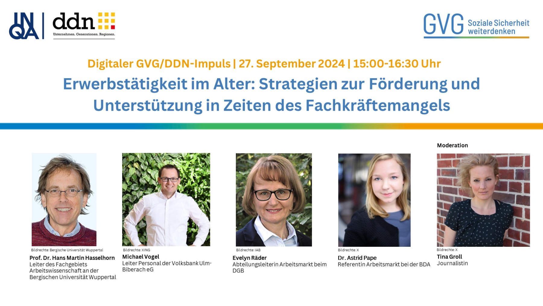 Wir bedanken uns bei allen Beteiligten und Gästen, die zu einer spannenden Veranstaltung zum Thema "Erwerbstätigkeit im Alter" beigetragen haben. In Kooperation mit dem ddn - Das Demographie Netzwerk e.V., haben wir uns damit befasst, wie wir angesichts des Fachkräftemangels die Erwerbsfähigkeit älterer Menschen erhöhen können. Großes Dankeschön an Prof. Dr. Hans Martin Hasselhorn (Bergische Universität Wuppertal), Dr. Astrid Pape (BdA), Evely Räder (DGB), Michael Vogel (Volksbank Ulm-Biberach eG) und Tina Groll (Moderation) für die wichtige Diskussion.