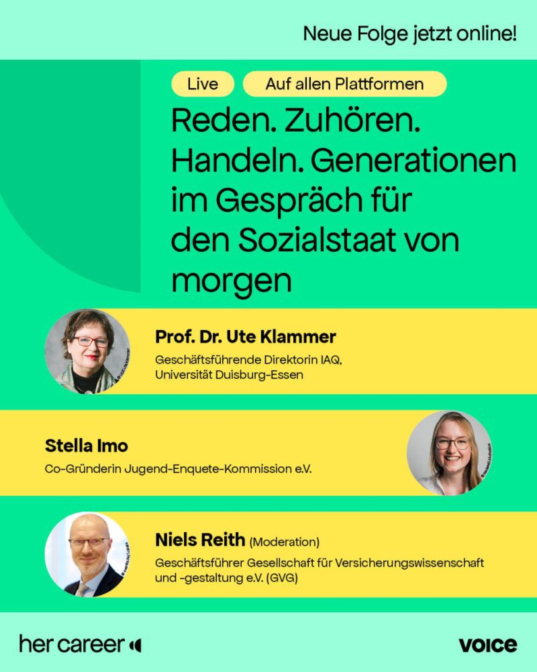 Im Anschluss an die Podiumsdiskussion „Zukunftssorgen jüngerer Generationen“ wurde eine Folge für das Podcastformat herCAREER Voice aufgezeichnet. In dem Gespräch diskutierten Prof. Dr. Ute Klammer (Professorin, Geschäftsführende Direktorin Institut Arbeit und Qualifikation, Direktorin Deutsches Institut für Interdisziplinäre Sozialpolitikforschung, Universität Duisburg-Essen) und Stella Imo (Co-Gründerin, Jugend-Enquete-Kommission e. V.), wie sich der Sozialstaat angesichts gesellschaftlicher und demografischer Veränderungen weiterentwickeln muss und wie ein konstruktives Miteinander der Generationen in den aktuellen Debatten gelingen kann. Moderiert wurde die Runde von Niels Reith (Geschäftsführer der GVG e.V.). Entstanden ist ein facettenreiches und anregendes Gespräch, das ab sofort auf allen gängigen Podcastplattformen verfügbar ist.