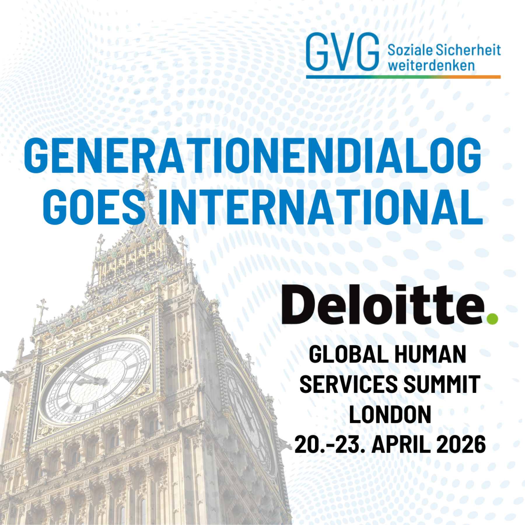 Nach dem großen Erfolg unseres zweiten Generationendialogs haben sich jetzt erfreulicherweise weitere Projekte ergeben. Auf Einladung unseres Unterstützers Deloitte werden wir auf dem Deloitte Global Human Services Summit London einen Workshop zusammen mit der Youth Foundation UK und der International Labor Organization organisieren, indem es um die Hürden von jungen Menschen gehen wird, die ihre Stimme in der Politik und den großen Herausforderungen unserer Zeit nicht repräsentiert sehen.